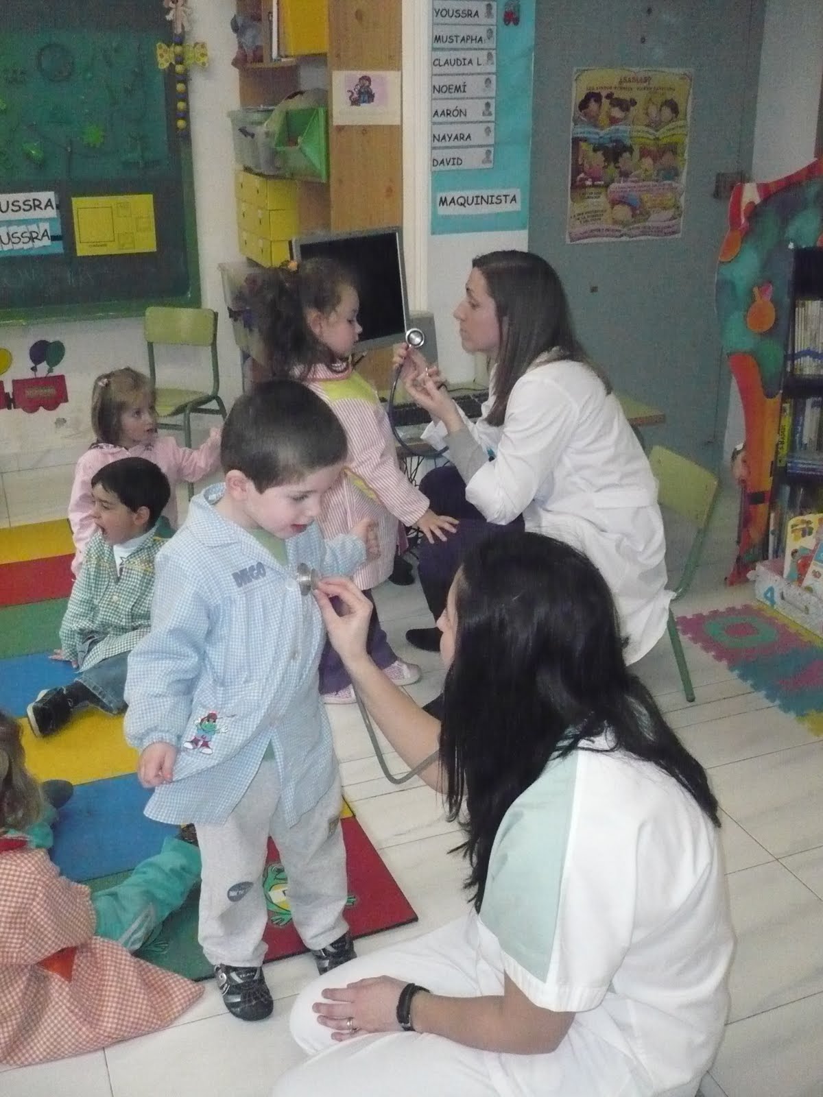 Somos los niños y niñas de la clase de tres años de Uruñuela. El pasado 24 de Febrero vinieron a visitarnos a clase una doctora y una enfermera para recordarnos lo importante que es comer sano y lavarnos las manitas antes de comer.También nos enseñaron que cuando tosemos hay que poner la manita y lo más importate, que para no ponernos malitos tenemos que abrigarnos muy bien.